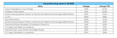 Q1’s top performers comprised a varied group from across Bordeaux, Piedmont, the Rhône, and Burgundy. The best performing wine was Vieux Telegraphe La Crau Rouge 2021, which surged 22.7%. Pichon Baron 2013 followed with a 22.6% rise.