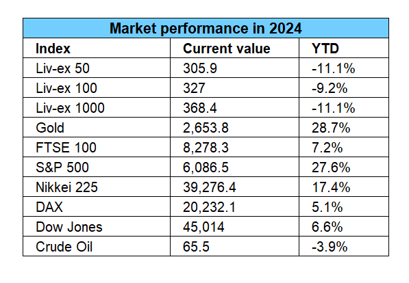 The fine wine market in 2024 continued its downward trajectory from 2023, with broad declines across major indices. The Liv-ex 100 has fallen 9.2% year-to-date, while the Liv-ex 50, which tracks First Growth Bordeaux, is down 10.9%.