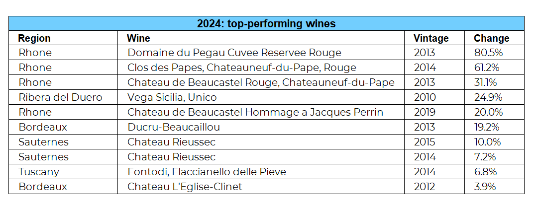 - Rhône wines dominated the list of the best performing wines in 2024, with Domaine Pegau Cuvée Réservée Rouge 2013 leading (80.5%).