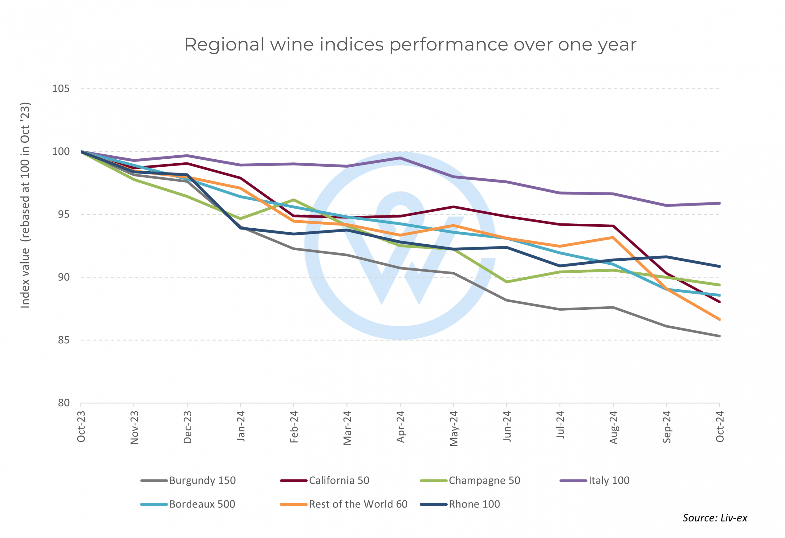 Champagne has changed its trajectory over the last year: from a fast faller like Burgundy to more consistency and stability. While prices are down 10.6% on average, the dips over the last few months have been smaller than 0.6%. The index also rose in February and August this year, driven by steady demand.